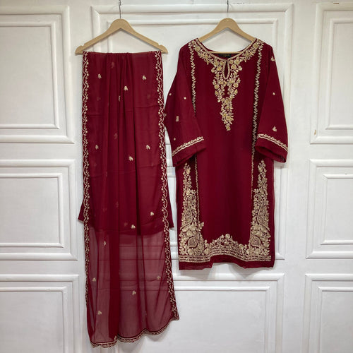 3 Piece - Pure Embroidered Bamber Chiffon RED Suit IS-0001